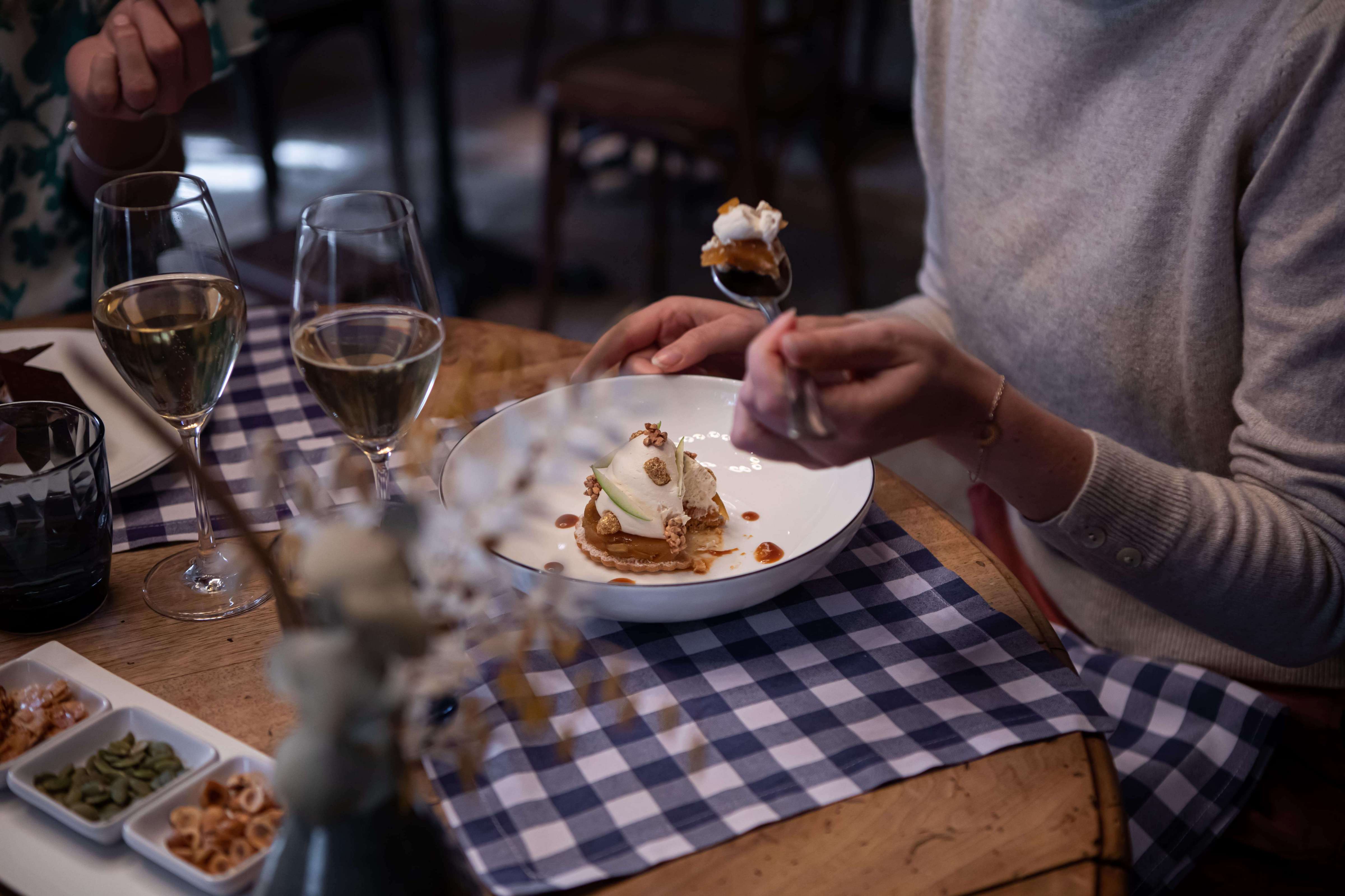 Si les mois d’hiver sont réchauffés par la lumière du feu de cheminée, aux beaux jours les tables sont dressées sur la terrasse du Bistrot, le long de la Bouzaise qui coule dans le parc de l’Hostellerie.