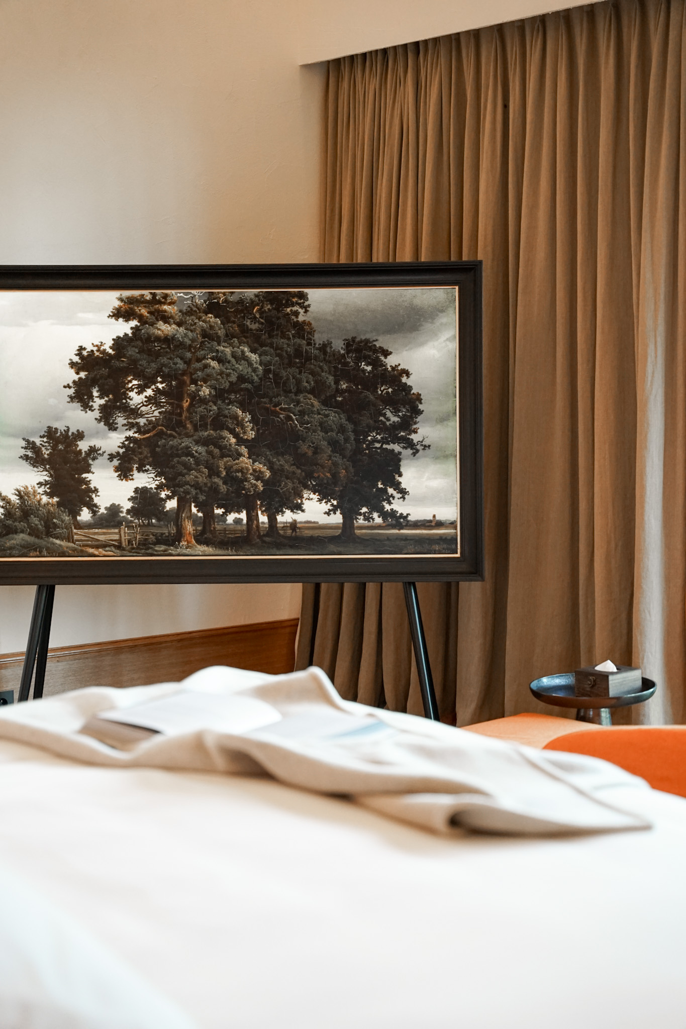 Dans la pièce principale, baignée de lumière au travers d'une large baie vitrée, sont installés lit king size, cheminée et espace salon pour des moments de détente en admirant le spectacle reposant du parc et de ses jeux de lumières. Le second espace nuit est situé en mezzanine dans un esprit cabane perchée.